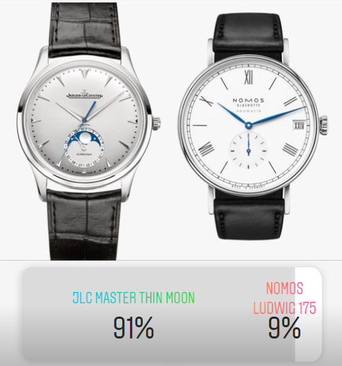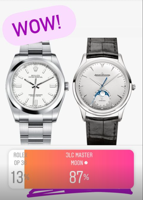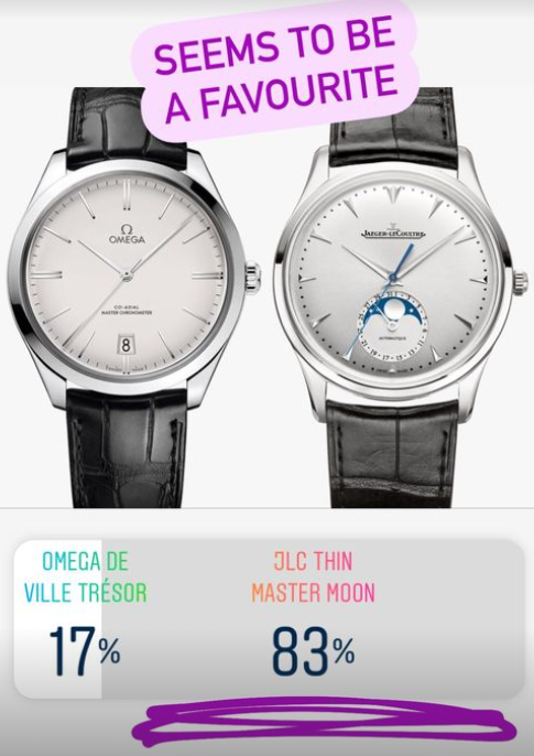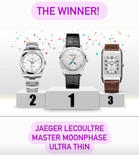 And so we move on to the Semi-Finals which had four excellent watches. The first dual was between the favourite Rolex Oyster Perpetual 36 and the Cartier Tank (quartz). It is probably no surprise but the Rolex won by some margin. Rectangular watches are not for everyone, and everyone knows Rolex so it really wasn’t to surprising of a result. Our other semi-final, however, definitely would have interesting results. The battle of the JLC’s! The Master Moonphase Ulra Thin ended up winning this round. I think again this was a story of rectangular watches not being for everyone. It was interesting to see that the incredible heritage of the Reverso didn’t give it a big enough boost. But hey, these were the results.