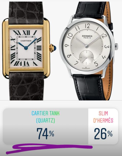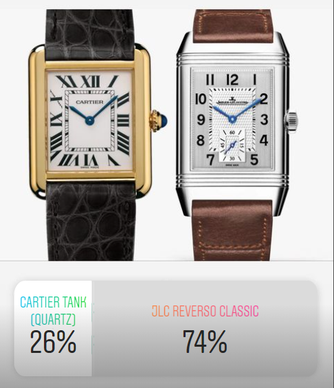 Round two featured a whole host of more watches and really interesting results. The Rolex Oyster Perpetual came up against the classic IWC Portofino. When I think of dress watches, the Portofino is the typical watch that comes to mind. Simple dial layout, date complication on a leather strap - what more do you need? But, the power of the crown continued into round 2 and the Rolex squeaked by a 4% margin. The next match up between the Cartier Tank (quartz) and the Slim D’Hermès was an interesting one. Both watches pack so much value into their watches. We think the Hermès lost because it may have reminded people more of an everyday watch. But hey, the people spoke and the Cartier moved on.