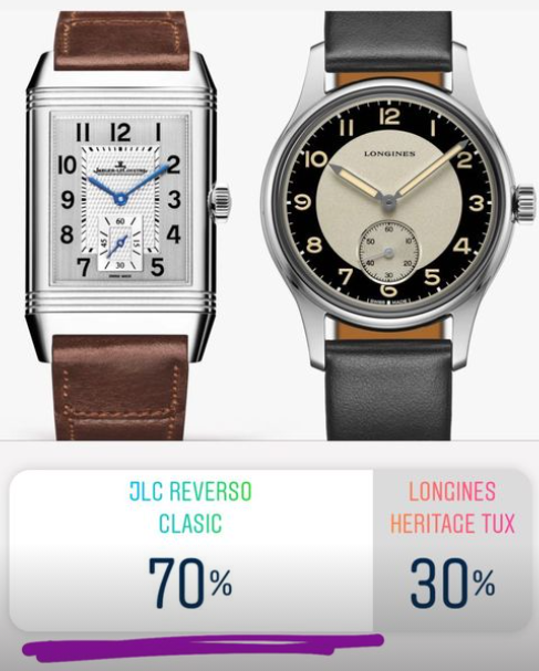 Our third match up was between the Omega De Ville Trésor and the JLC Master Moonphase Ultra Thin and wow, did the JLC continue its run. The Omega has become a real classic and hugely desired watch but the JLC’s classical style and incredibly high finishing pulled it through with another big victory. Our last match up of round 2 was between the JLC Reverso Classic and the Longines Heritage Tuxedo. We really thought the Longines would win this dual. Not because we thought the Reverso was inferior, but because the Tuxedo is by far one of the best watches Longines has released in a while. But, the power of the Reverso came through and they convincingly beat the Longines.